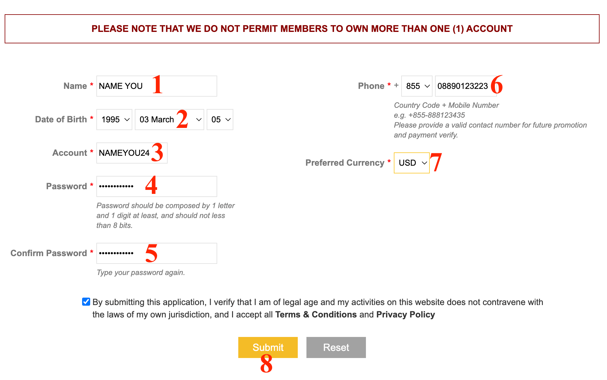 1. សូមបំពេញឈ្មោះរបស់លោកអ្នក (អាចយកឈ្មោះតាមអត្តសញ្ញាណប័ណ្ណបាន)